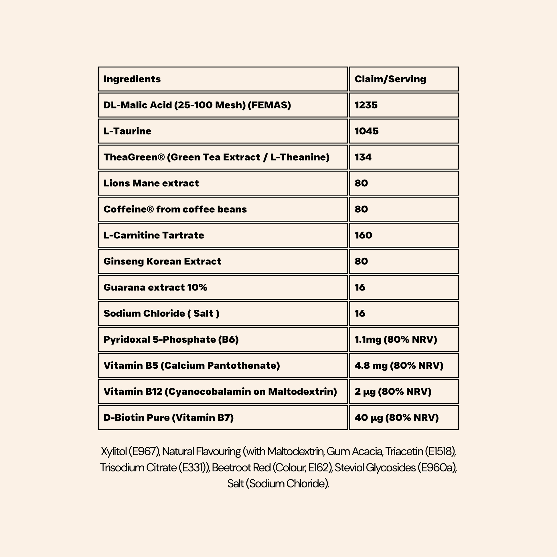 DL-Malic Acid, L-Taurine, Xylitol, TheaGreen®, Lions Mane, Coffeine® (Natural) from coffee beans, L-Carnitine Tartrate, Ginseng Korean, Guarana, B12 Vitamin, B6 Vitamin, Biotin, Sodium (Salt), Cherry, Stevia.